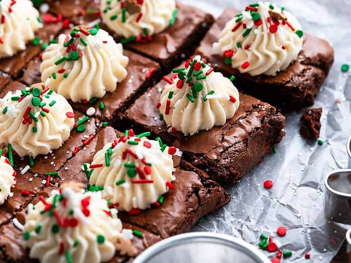 These gingerbread brownies are topped with eggnog buttercream and sprinkles for festive flavours.
