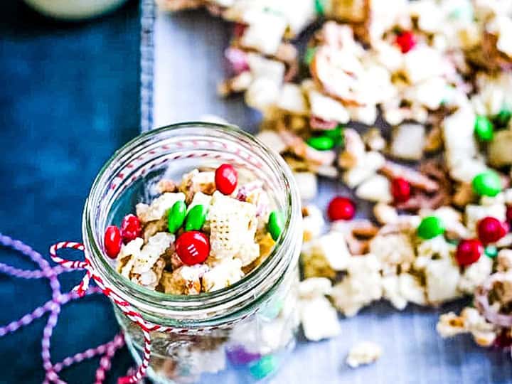 A fun Christmas snack mix with white chocolate and M&Ms.