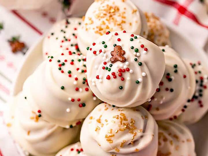 These gingerbread truffles are made with gingersnaps, cookie butter, warm spices, and sugar then dipped in white chocolate.