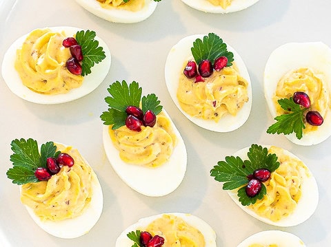 Deviled eggs are a holiday essential, with the added sweet burst of pomegranate seeds. Yum!