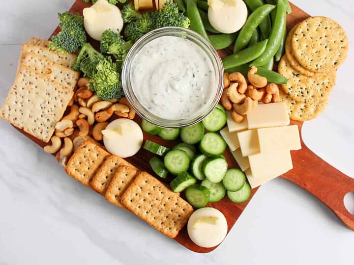 This healthy Easter grazing board is loaded with green crunchy vegetables, crackers, nuts and dip.