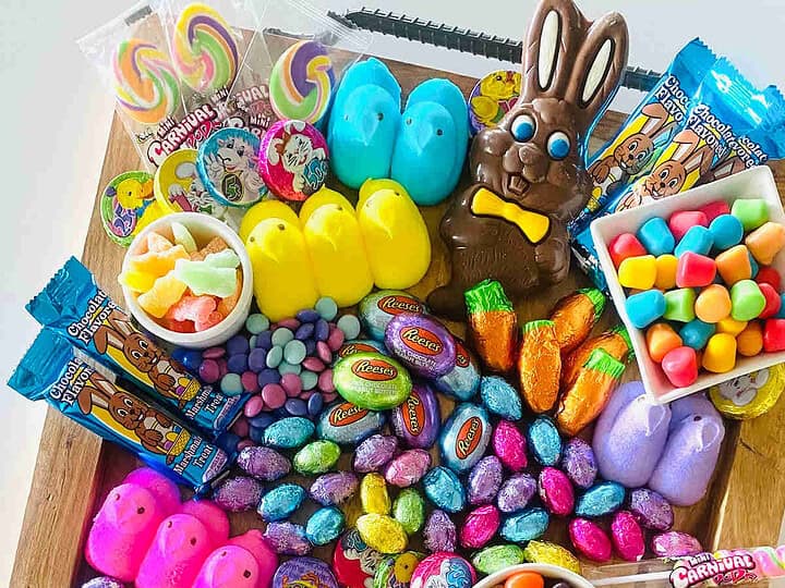 - Easter Candy: Chocolate eggs, jelly beans, Peeps, and pastel M&M’s.