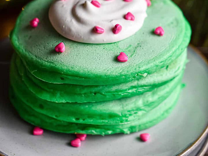 These fluffy green Grinch pancakes are topped with whipped cream and candy hearts, making breakfast extra festive. A fun addition to your North Pole breakfast!