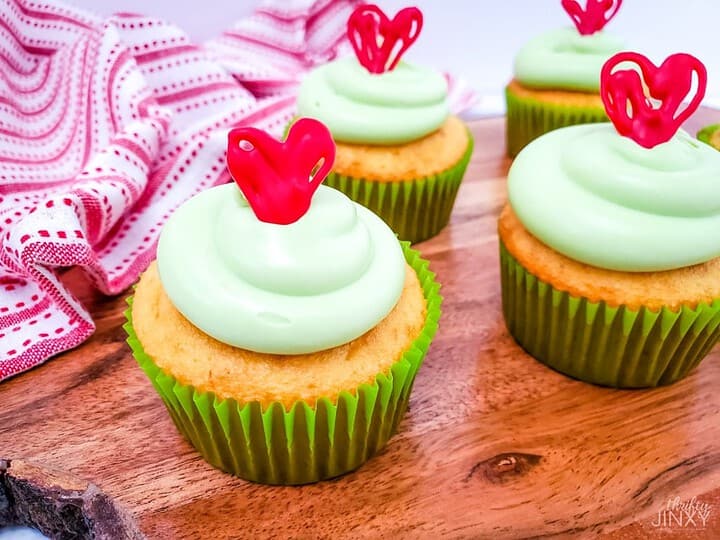 These adorable Grinch cupcakes feature bright green frosting and a tiny red candy heart, perfect for a festive treat.