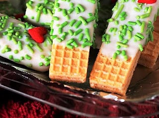 These crunchy Grinch white chocolate sugar wafers are dipped in green chocolate and topped with red heart and sprinkles for an easy and festive treat.