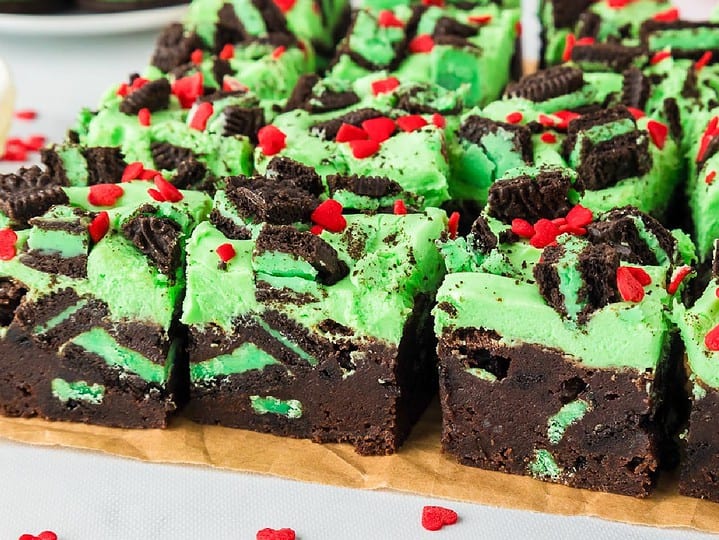 These fudgy Grinch brownies are topped with vibrant green icing, stuffed with mint Oreo cookies, with red candy hearts to capture the spirit of the season.