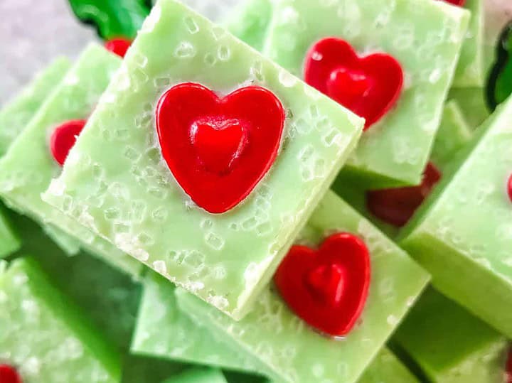 This creamy Grinch fudge is a simple no-bake treat with green layers and a signature red heart candy on top.