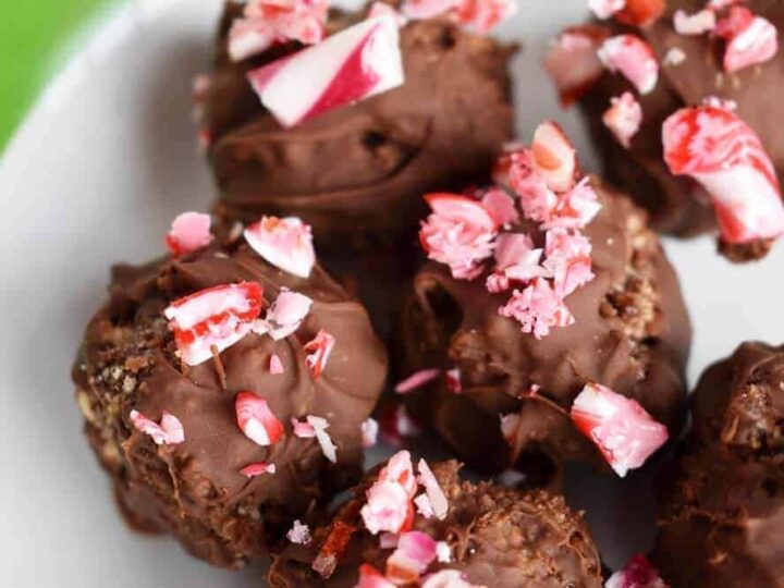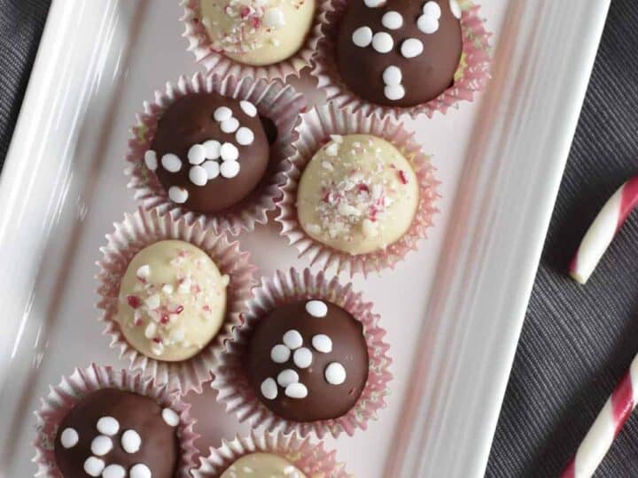 These chocolate-coated candy cane truffles are everything you love about rum balls (minus the rum) and loaded with extra chocolate and crushed peppermint.