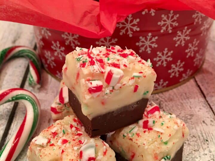 Our Candy Cane Fudge recipe is the perfect holiday dessert for gift-giving and serving! A rich chocolate layer is topped with candy cane studded white chocolate making Candy Cane Fudge an easy to make dessert and the perfect Christmas fudge gift to give!