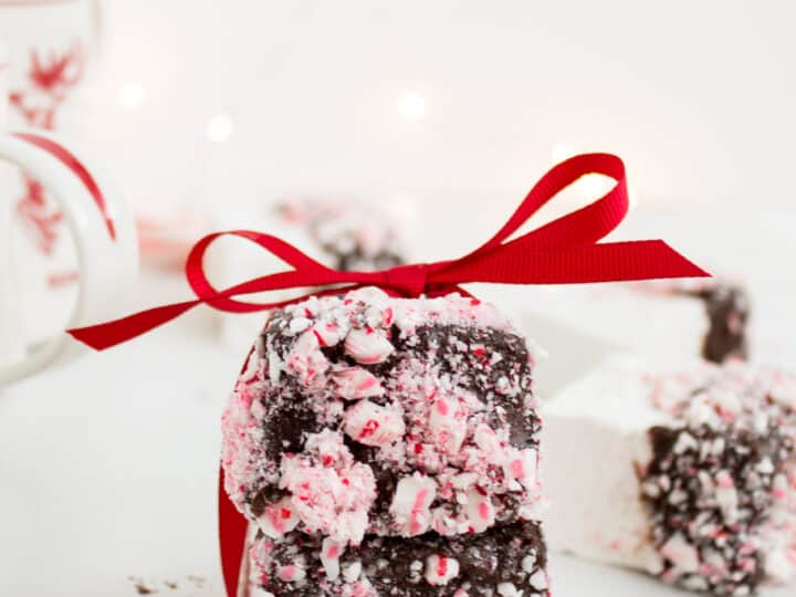 Homemade marshmallows decorated in chocolate and candy cane pieces. What a beautiful gift idea!