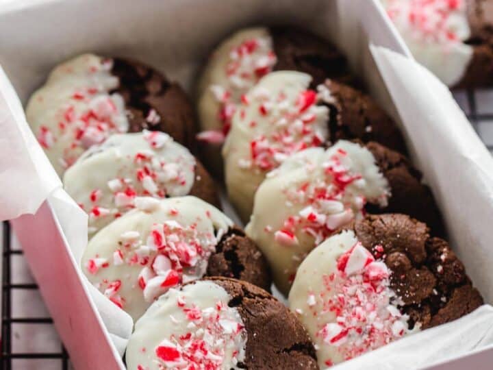 Rich & chewy Double Chocolate Mint Cookies are not only filled with mint chocolate chips but dipped in chocolate too then sprinkled with crunchy peppermint pieces. A perfect Christmas treat!