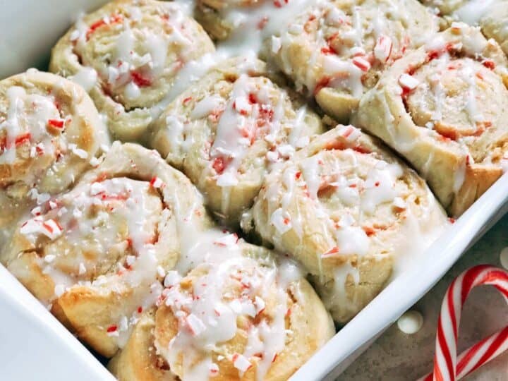 These delicious Homemade Peppermint White Chocolate Sweet Rolls are packed with candy canes and a perfect holiday breakfast or dessert!