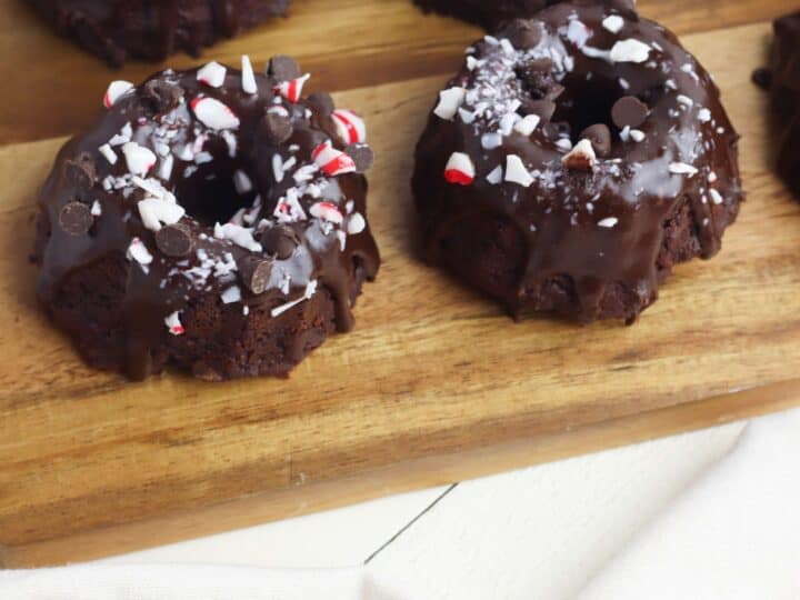 These chocolate peppermint mini bundt cakes are super easy to make! They use a combination of cake mix, frosting and crushed peppermint on top.