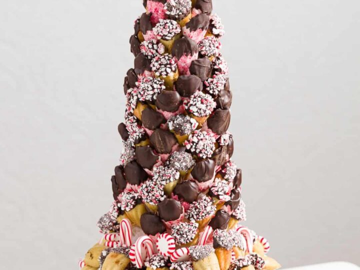 Cookie trees work so well as dessert table centerpieces! While you can make them with any kind of cookies, I find that madeleines look particularly beautiful - especially when coated with or made of crushed candy canes.