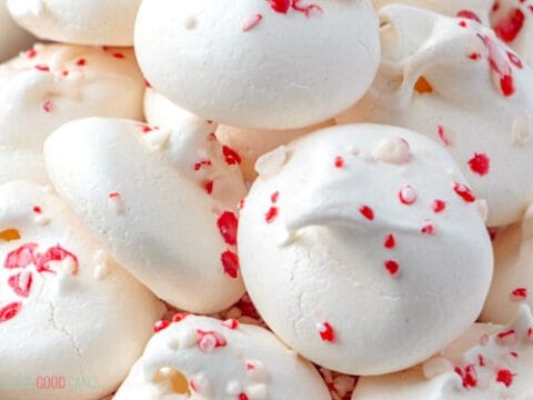 White meringues with flecks of candy cane make these beautiful for gifting or simply for enjoying as a treat at home.