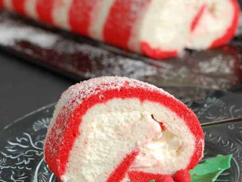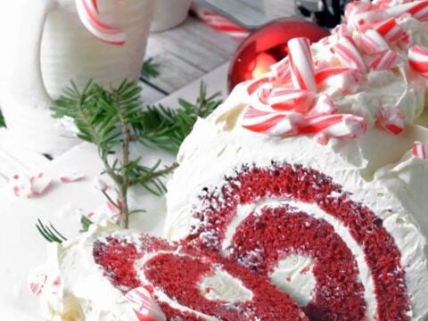 This Red Velvet Cake Roll with Chocolate & Peppermint Butter Cream Frosting features a crushed candy cane topping. No wonder it is one of Santa’s favorite desserts!