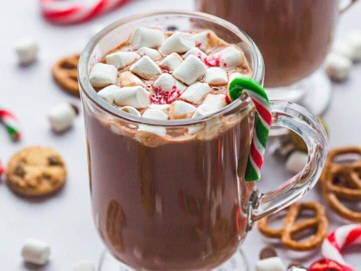 This homemade Peppermint Hot Chocolate recipe is made with 6 ingredients in 6 minutes! It has two kinds of chocolate so it’s ultra-rich and creamy and it’s flavoured with candy canes instead of expensive extracts.
