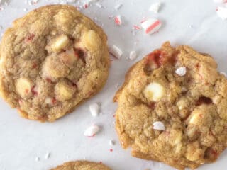 Made w crushed candy canes and white chocolate chips stirred into an easy cookie recipe, with crisp edges and chewy centres.