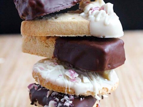 Make these easy white chocolate dipped shortbread cookies and sprinkle the tops with crushed candy canes for a fun & quick holiday dessert!