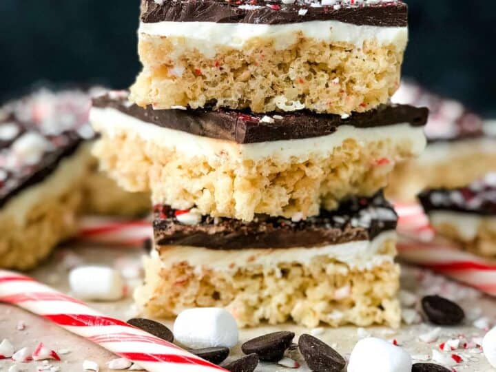 These Peppermint Bark Rice Krispie Treats are filled with candy canes and topped with chocolate for a delicious dessert that is also beautiful! A great unique idea for a cookie exchange.