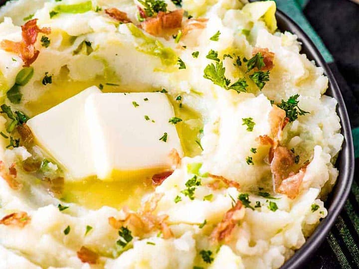 Colcannon are traditional Irish mashed potatoes, made with cooked cabbage, creamy potatoes, milk, and green onion, then topped with pieces of bacon.