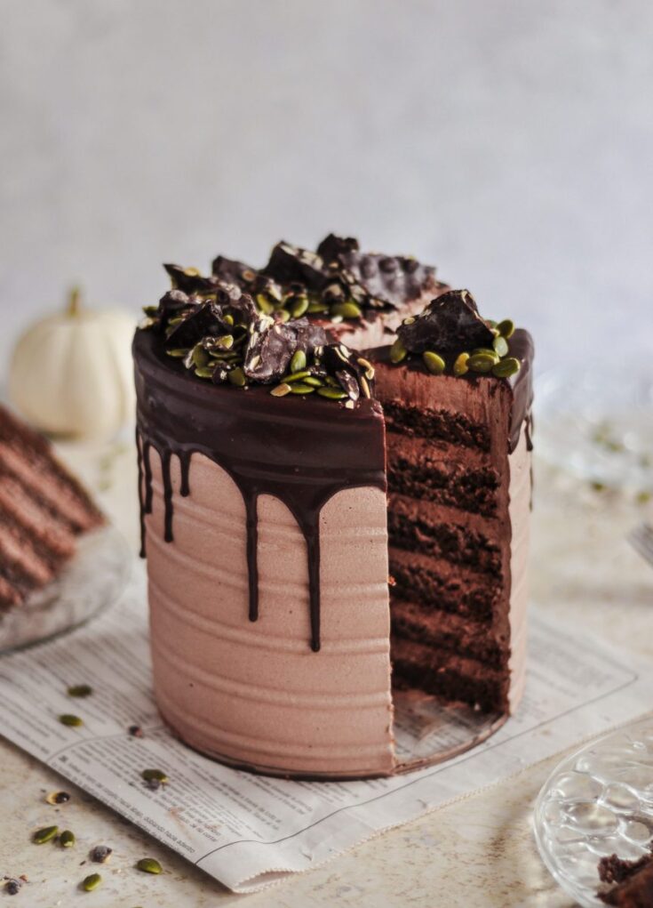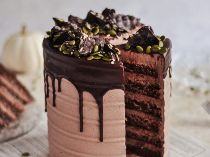Soft, moist layers of pumpkin cake are stacked high and slathered with rich, fudgy dark chocolate buttercream frosting—talk about a cake cacophony! This dairy-free chocolate pumpkin cake is like a cozy autumn sweater for your tummy—comforting, indulgent, and full of seasonal warmth.