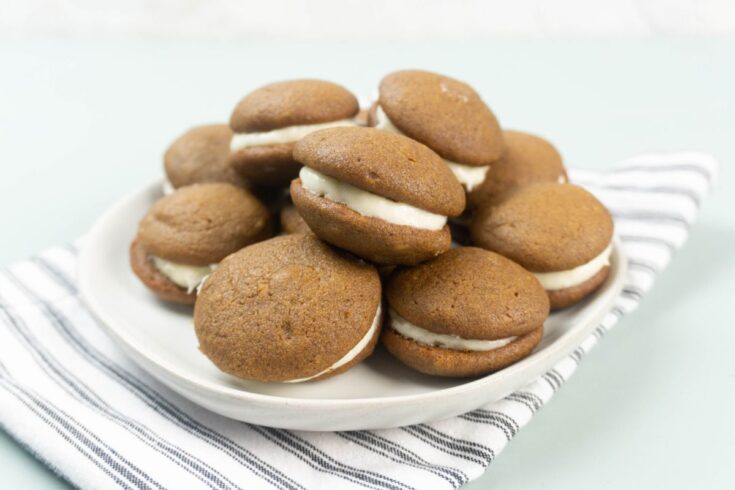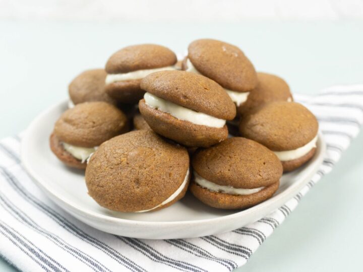 These indulgent whoopie pies feature a rich and creamy maple cream cheese filling nestled between two perfectly baked soft pumpkin spice cookies. A fall-inspired treat that’s irresistibly delicious!