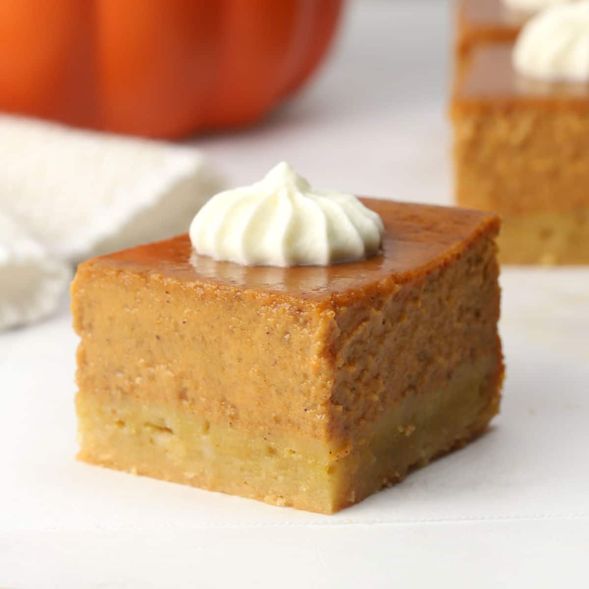 Pumpkin Pie Bars give you the delicious flavour of your favourite pumpkin pie in an easy-to-serve bar form! A buttery shortbread crust is topped with rich, smooth pumpkin pie filling—perfect for any fall celebration.