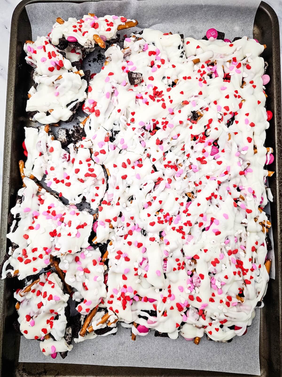 - Add extra sprinkles or drizzle with coloured chocolate for a more decorative Valentine bark.