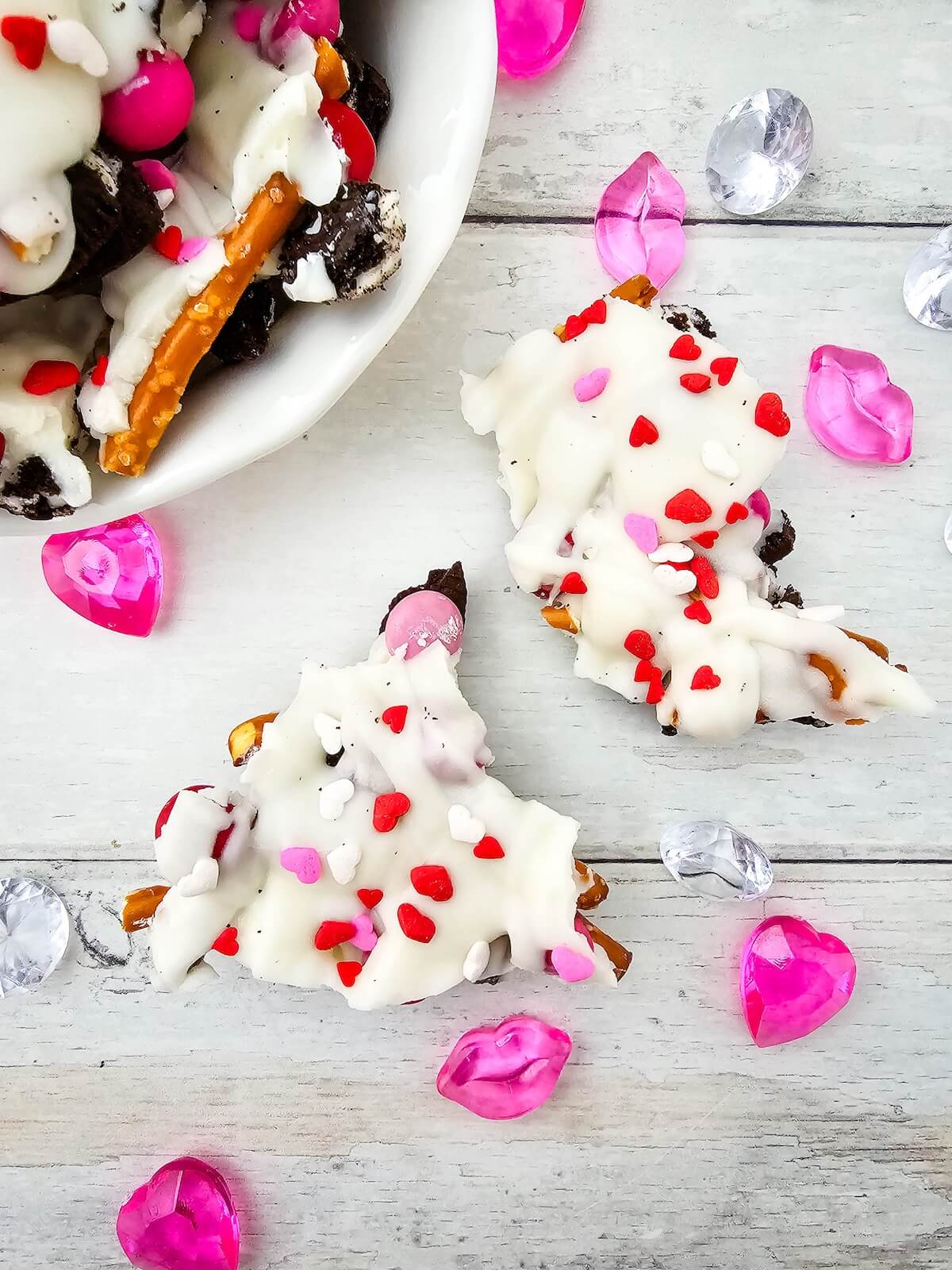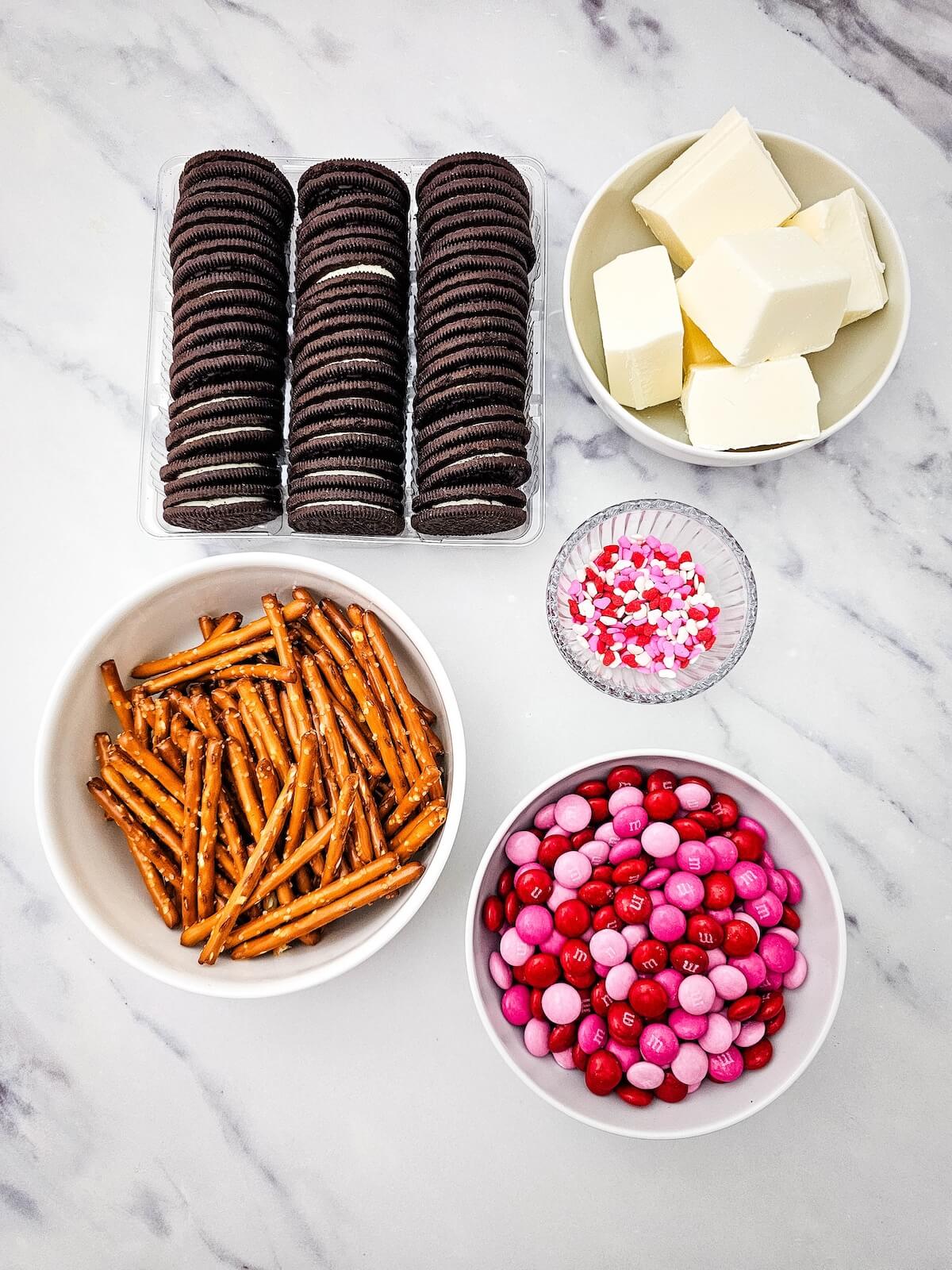 - Sprinkle the pretzel pieces and Valentine M&Ms over the Oreos.