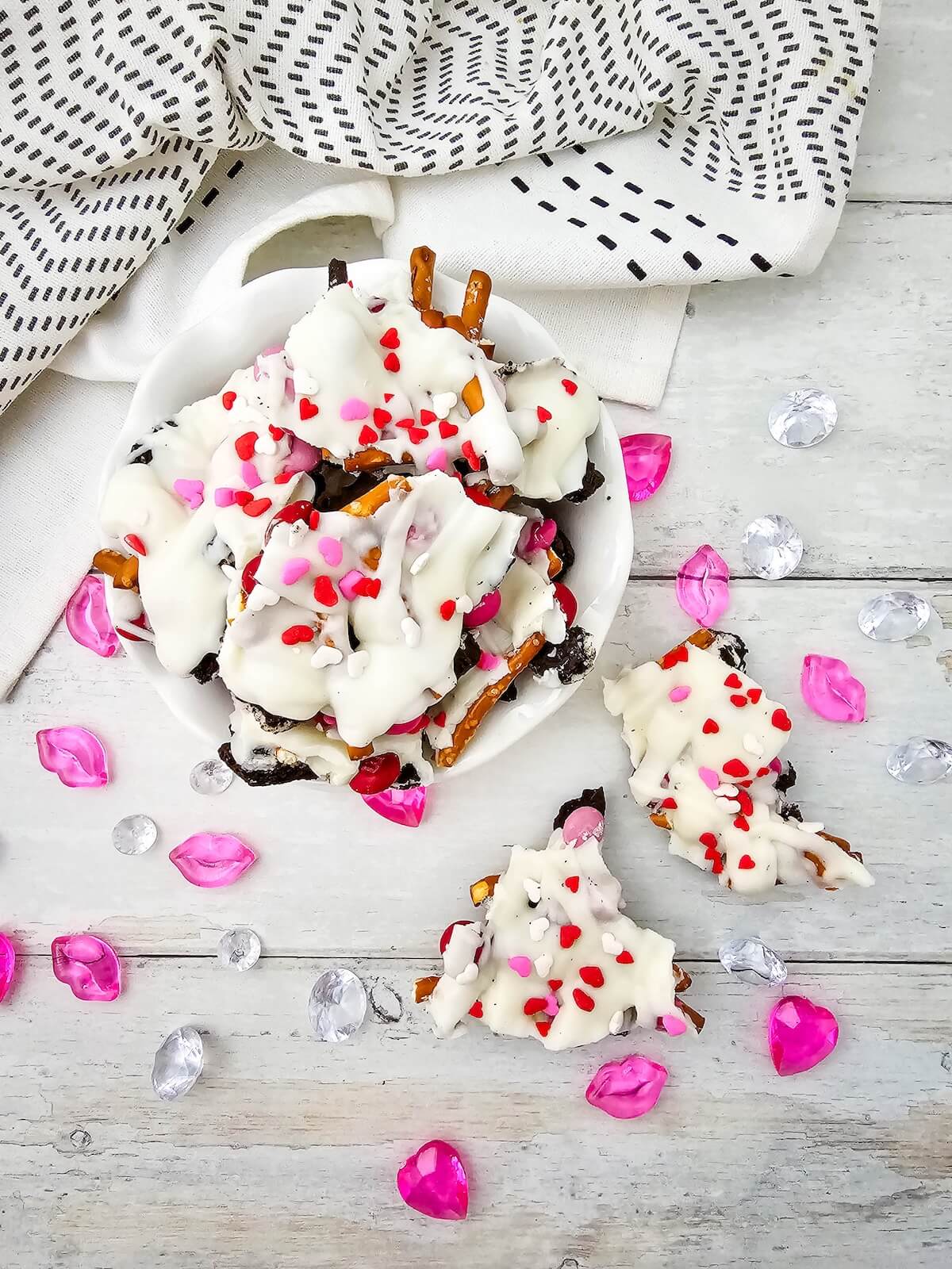 This Valentine’s Day chocolate bark is a quick and easy sweet-and-salty Valentine’s treat made with melted chocolate, Oreos, pretzels and Valentine’s M&Ms. Perfect for gifting or parties.