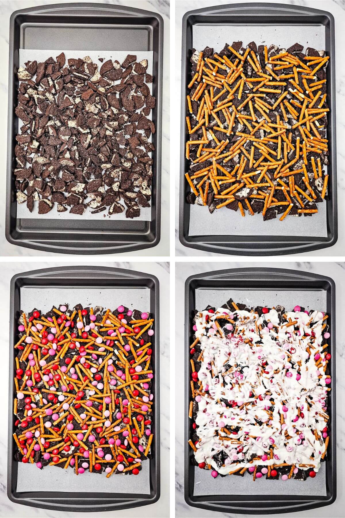 Break the Oreo cookies into smaller pieces and spread them evenly over the prepared baking sheet. You can do this by hand or put them in a ziplock bag and smash them into smaller pieces with a rolling pin.