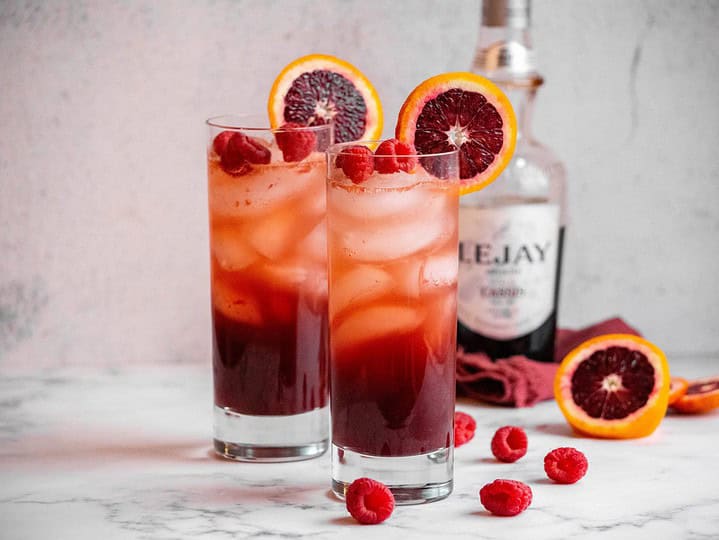 This raspberry vodka spritzer has freshly squeezed blood orange and creme de cassis for a deep red cocktail that will impress.