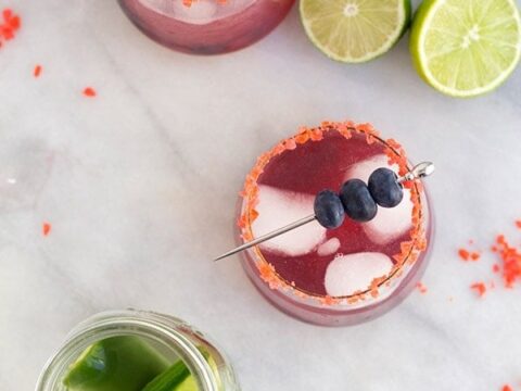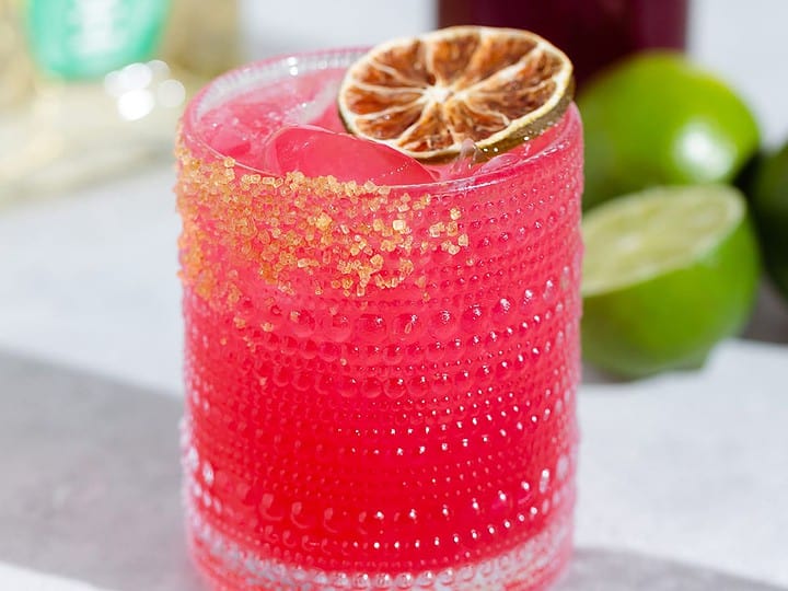 This vibrant margarita has a fun floral twist, with homemade hibiscus syrup to give it the beautiful pink hue.