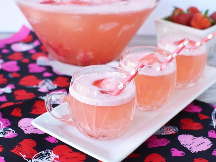 The perfect pink party punch is easy to make! This Sparkling Valentines Day Punch has a touch of sweetness and looks pink, thanks to strawberry sorbet.